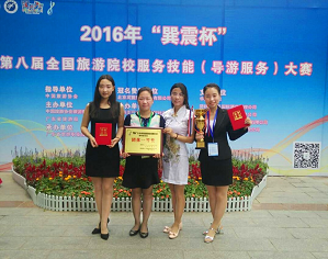 5月12日—15日,“巽震杯”第八届全国旅游院校服务技能(导游服务)大赛在广州市成功举办。本次大赛吸引了全国的335所高等院校和中职学校的956名选手参赛,规模达到历年之最。经过理论考核、才艺展示、导游讲解、专题讲解四个环节的激烈角逐,公司旅游管理专业同学鹿晶晶、刘梦琦不畏强手、从容应对,喜获高等院校组普通话导游服务一、三等奖,同时公司荣获“团体一等奖”;贾爱顺、崔霄老师被评为“优秀辅导教师”。此外,鹿晶晶精彩的才艺展示亦得到了现场媒体的关注,并接受采访。